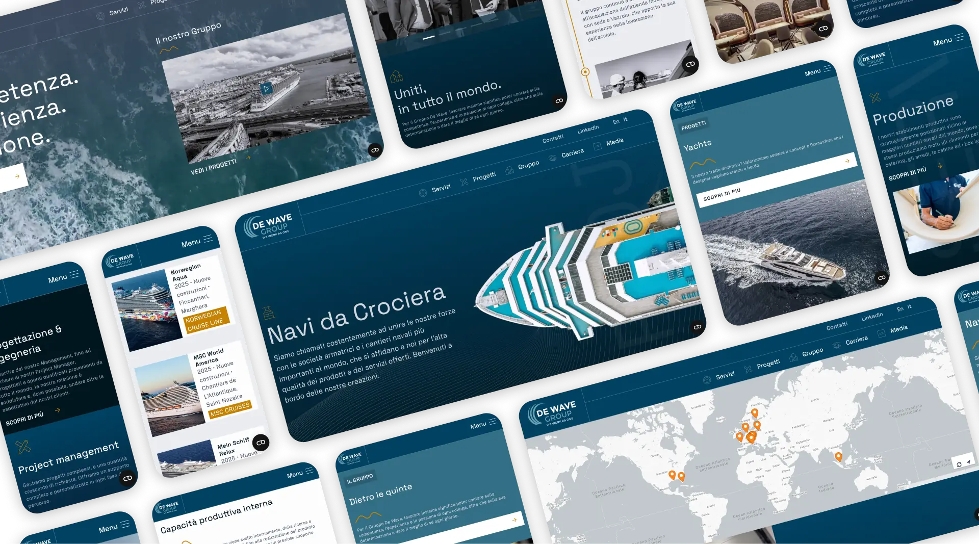 Una delle principali riguardava l’integrazione della lingua italiana all’interno del sito, elemento cruciale per rafforzare la presenza di De Wave Group sul mercato locale e per rendere la comunicazione più accessibile e rilevante per il pubblico nazionale. Allo stesso tempo, era necessario armonizzare un’identità visiva già consolidata ma frammentata, integrando una molteplicità di asset grafici precedenti in un unico linguaggio coerente, moderno e riconoscibile, capace di rappresentare efficacemente l’evoluzione del gruppo.